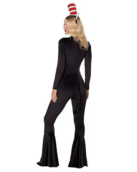 Suit up and start your wacky adventure with this Adult Cat in the Hat Bell Bottom Costume! This officially licensed costume includes a black jumpsuit with an attached tail as well as a cat-eared headband topped with the Cat in the Hat’s iconic red and white striped top hat. Show your love for your favorite storybook character with this adorable ensemble!
