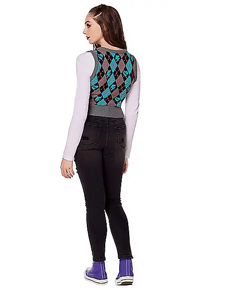 You’ll be the coolest ghoul in school when you wear this Monster High sweater vest. This Monster High alumni sweater features an argyle print complete with lightning bolts and damaged hearts. A sweet, bow-wearing skull adorns the chest, making this sweater a monstrous hit.