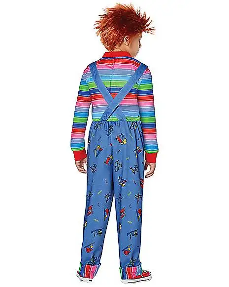 Wanna play?! This officially licensed Chucky costume is perfect for every little boy that wants to cause some trouble on Halloween night. Slip into the overall costume and attached shirt and add the orange wig for a complete look!