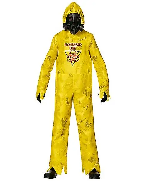 Gross out the gang in this altogether creepy Hazmat Hazard Child Zombie Costume. The yellow, 100% polyester jumpsuit features Hazmat graphics and fake toxic waste, complete with a matching hood, horrifying mask, gloves and a mesh printed sleeve suggesting a severe chemical burn.