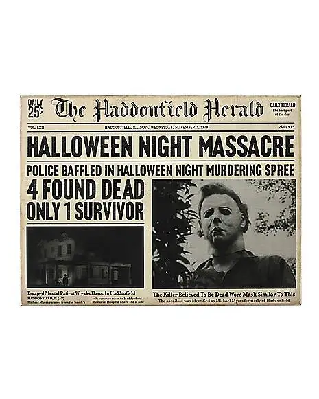 Decorate your home with a piece of Halloween history with this officially licensed Michael Myers Haddonfield Herald Sign. This snippet of what’s dubbed the “Halloween Night Massacre” shows an image of Michael Myers next to the headline that reads “4 Dead Only 1 Survivor.” If you’re a fan of the Halloween movies, this sign is a super cool tribute to the events of the film and will look great as a decoration.