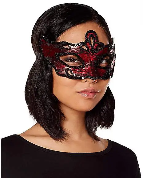 You’ll be the most mysterious beauty at the party in this stunning red and black eye half mask. Adorned with shiny black sequins and delicate lace, this mask is the perfect romantic accessory.