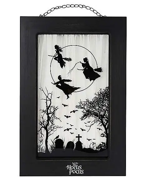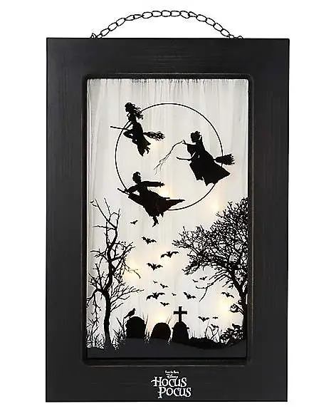 Light up your haunted house in witchy style with this Sanderson Sisters Light-Up Hanging Window Sign! This enchanting sign features all three Sanderson Sisters soaring through the night as stars light up and twinkle in the background. This spellbinding sign is the perfect choice for any Hocus Pocus fan or witch-in-training!