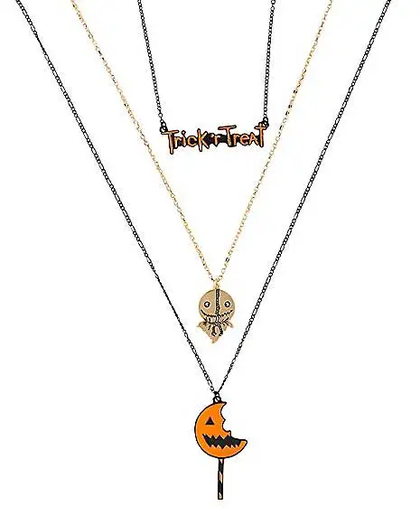 Decorate yourself with the rules of Halloween! This three piece necklace set is the perfect way to show off your Trick ‘r Treat fandom and always be ready for Halloween.