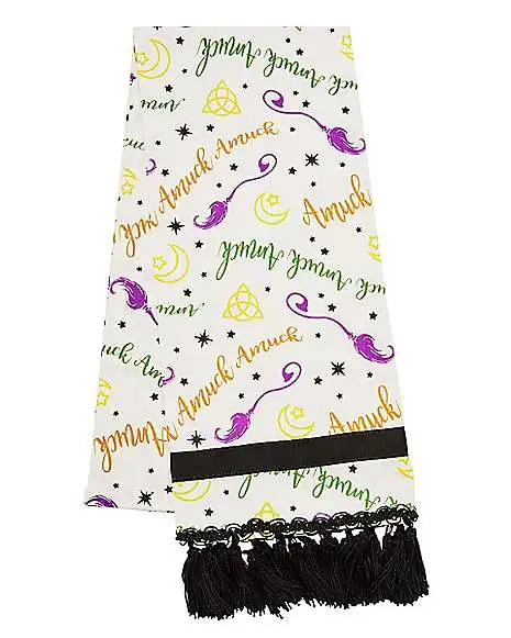Serve up a double helping of Hocus Pocus with this dishtowel set. Each dishtowel offers a different but complementary look, with a black dish towel that says “Trouble is Brewing” featuring silhouettes of the Sanderson sisters along with yellow tassel while one with a white background features a multi-color design saying “Amuck Amuck” with a black tassel. These are must-haves for any Hocus Pocus fan!